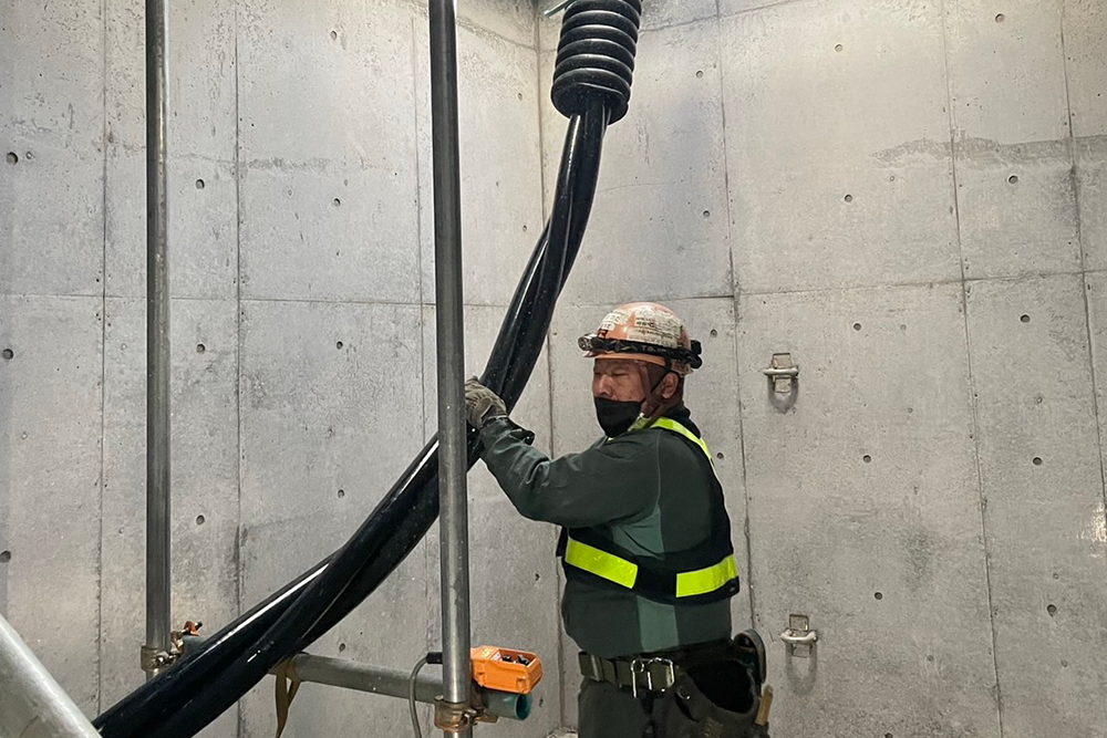 地中電気ケーブル工事には高所作業も含まれますが、私たちは安全最優先で作業を行なっています。熟練の有資格者が長年の経験とノウハウを活かし、チームワークによって正確な工事を実施いたします。